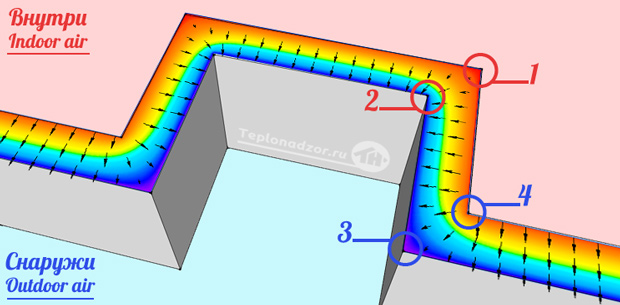 Причина этого в том, что площадь теплоотдачи у такого угла снаружи значительно больше больше, чем площадь получения тепла изнутри, поэтому он охлаждается сильнее и там возможна конденсация влаги и даже промерзание.