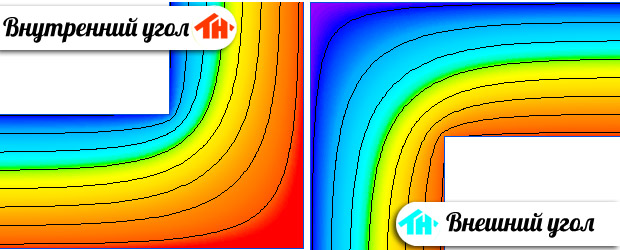 На рисунке видно, что распределение тепла во внешних и внутренних углах значительно отличается: