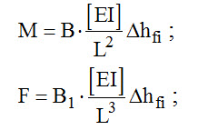 B, B1 - коэффициенты, зависящие от конструкции здания (см. ВСН 29-85, рис. 5 и 6);[EI] - приведённая к простой балке жесткость здания;Δhfi - разность деформаций пучения различных частей здания;L - длина самой длинной стены здания