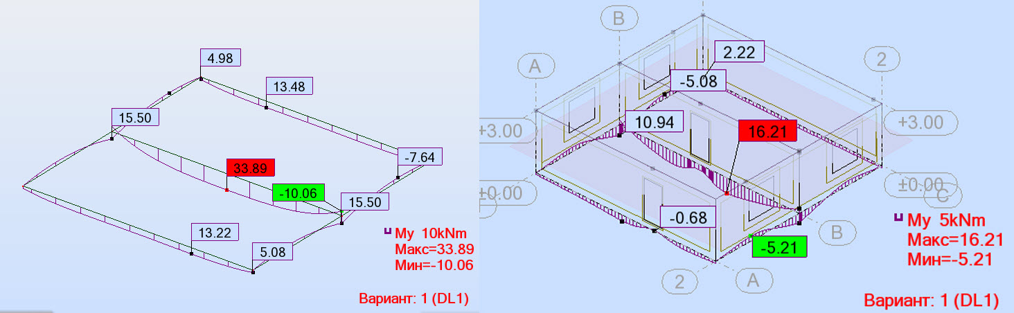 Из представленных рисунков видно, что реакция грунта основания во втором случае более равномерная (а значит и нагрузка от надфундаментной части приложена к фундаменту более равномерно), разница в осадке различных частей фундамента меньше. Соответственно меньше и изгибающие моменты в конструкциях фундамента (в данном случае в 2 раза).